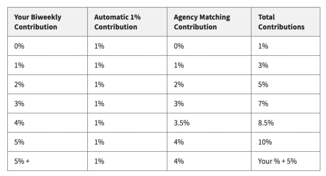 Like many employers, the plan offers a match, up to 5% when an employee also contributes 5% (a full match on the first 3%, and a 50% match on the last 2%). This is in addition to the automatic 1% contribution your agency makes on your behalf each pay period. For this reason, make sure you change your automatic deduction to 5% to take full advantage of this benefit.
